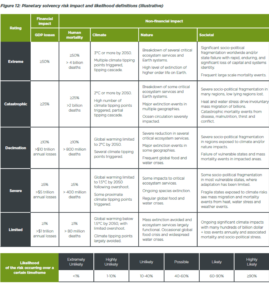 The IFoA team did an example exercise to indicate what a more appropriate risk assessment could provide. Their Planetary Solvency Dashboard indicates current risk levels for climate, nature, society and economy.
